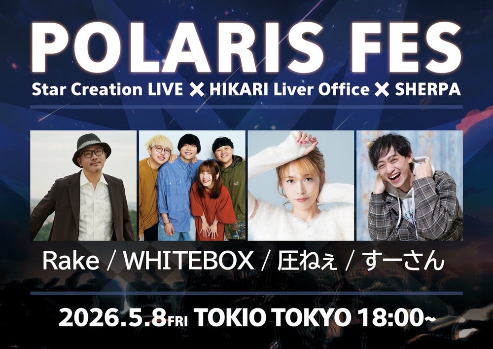 出演者 ・Rake ・WHITEBOX ・圧ねぇ ・すーさん ・HIKARI Liver Office所属ライバー ・LKS☆24LIVE所属ライバー ・Star Creation LIVE所属ライバー ※詳細はPOLARIS FES公式WEBサイトにて順次公開予定です。 ※POLARIS FES公式WEBサイトは後日解禁いたします。